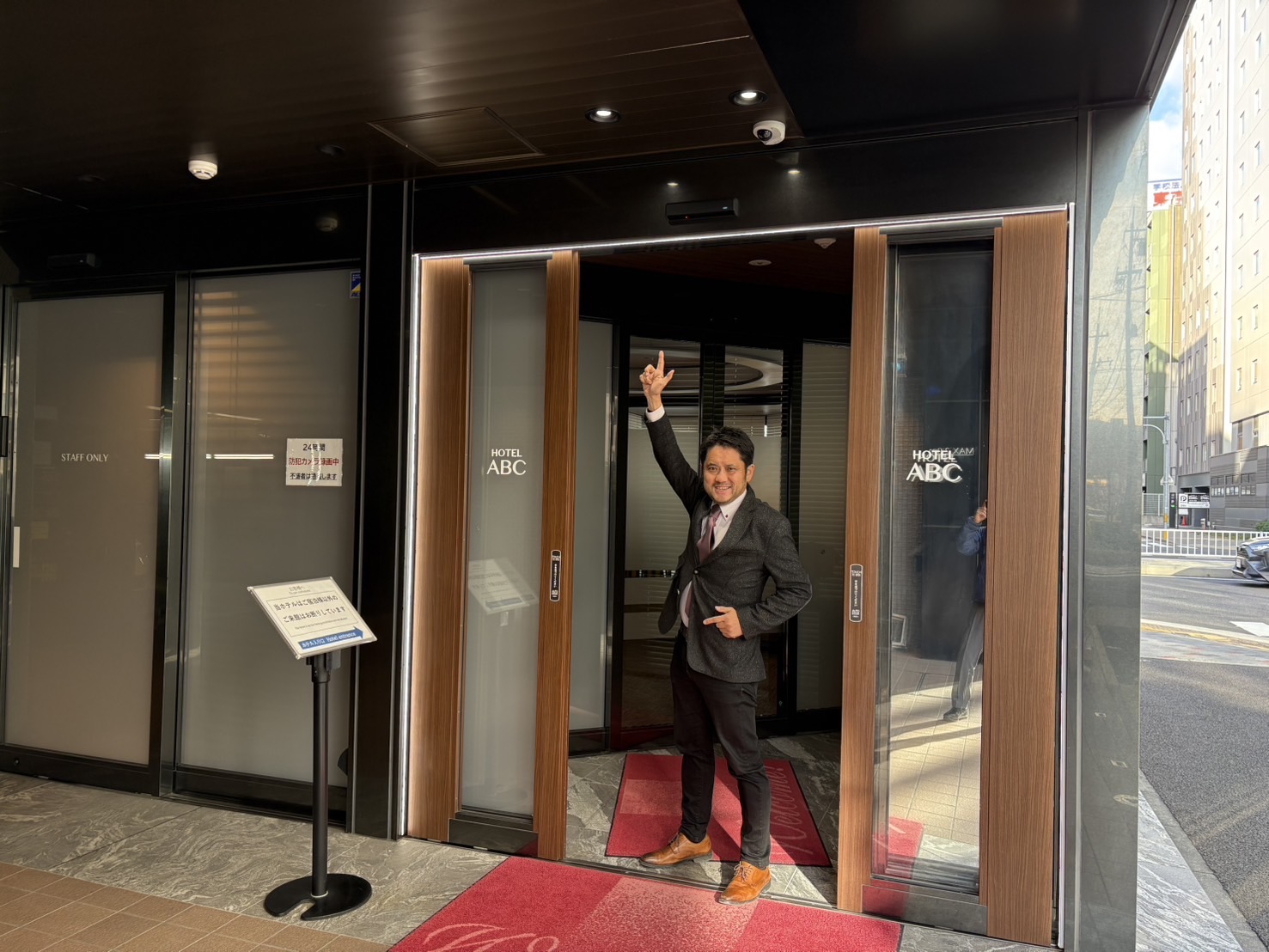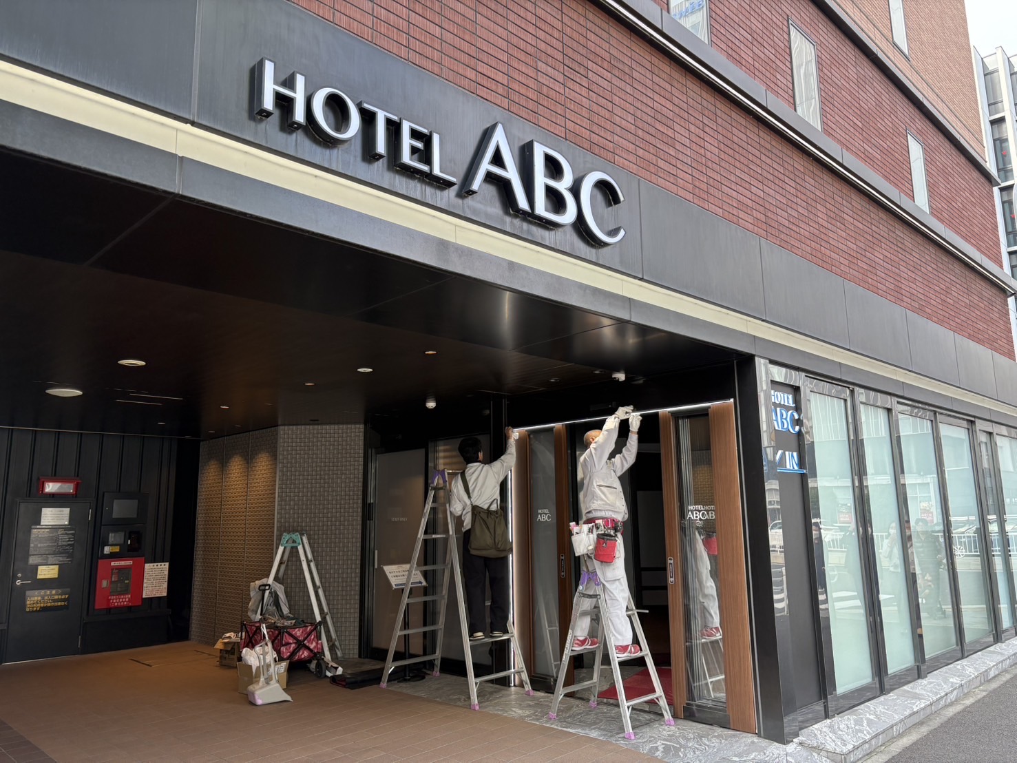 いつもビジネスホテルABCのご利用ありがとうございます。お客様のご意見で、入り口が分かりずらいとのご指摘があり、社内でも検討し、より分かりやすくする為に本日工事をし、入り口にLEDライトを設置致しました〜